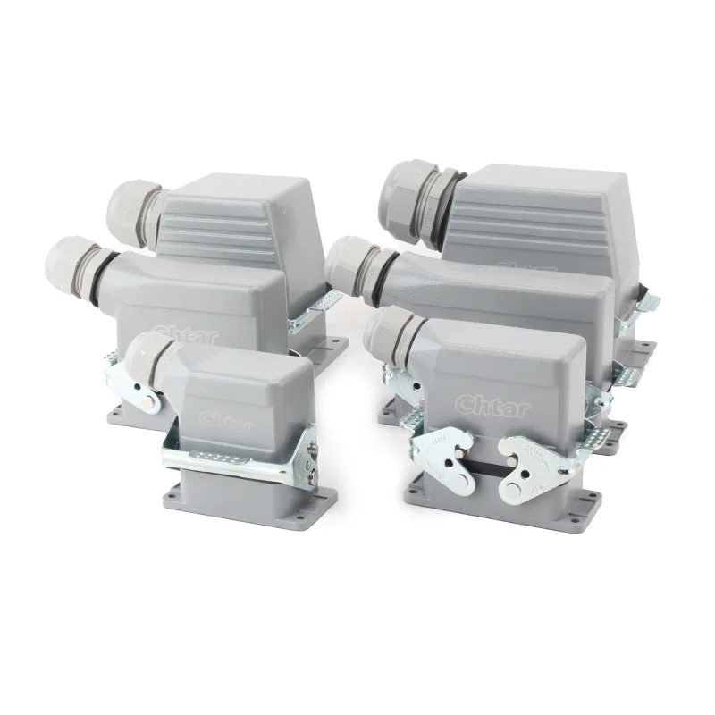 The durable 24 Pin AG Heavy Duty Connectors designed and produced by CHTAR is suitable for 24-pin HE, HD, HEE, HDD and other heavy-duty connectors. The connector is made of aluminum alloy and coated with RAL7037 grey powder. Its operating current is 16A, the operating voltage is 500VAC, the operating temperature range is -40℃ to +125℃ (-40℉ to +257℉), the plugging and unplugging cycles are 500 times, and the protection grade is IP65.