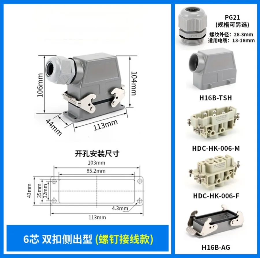 80A 4+2 Pinli Daxil Ağır Yük Konnektoru işlənmişdir H16B-TSH alüminium Ağır yük konnektorunun korpusu. Güclü PC materialından və mis gümüşlə örtülmüşdür. CHTAR mis sancaqlar yaxşı keyfiyyət və daha yaxşı elektrik keçiriciliyi olan gümüşlə örtülmüşdür. Yaxşı suya davamlı xüsusiyyət etmək üçün möhürləyici rezin ehtiva edir.
