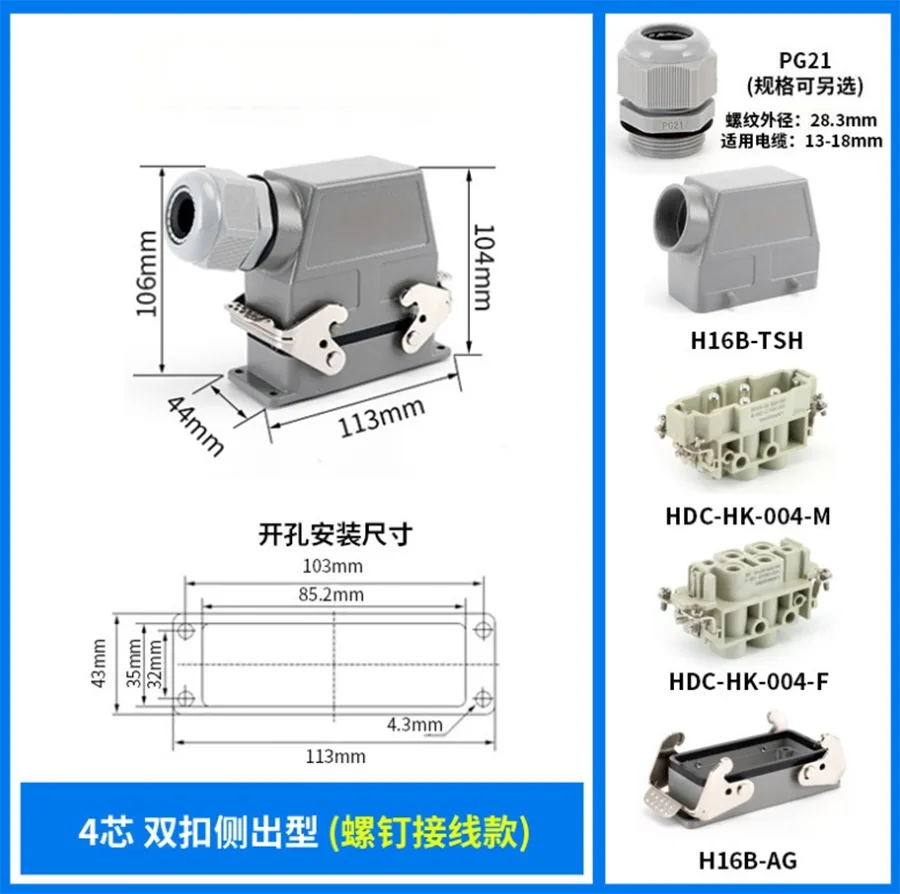 HK-004/0-M HK Ağır yük konnektorları 80A cərəyan altında işləyir. Naqillərlə təmasda olmaq üçün 4 pindir. Fərqli iş şəraiti üçün təklif olunur və avtomatik sənayelərdə və maşın naqillərinin birləşdirilməsi növlərində istifadə olunur.